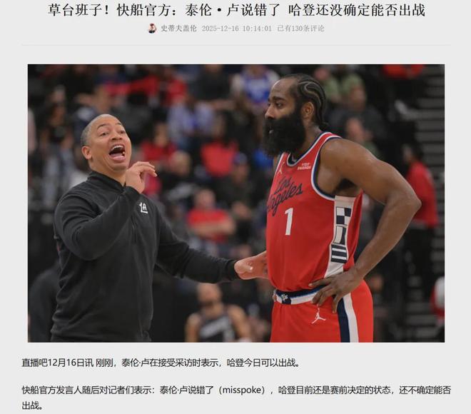 结果快船官方发言人随后跟记者们“辟谣”:泰伦·卢说错了(misspoke),哈登的状态是“赛前决定”,今天打不打还没确定呢。